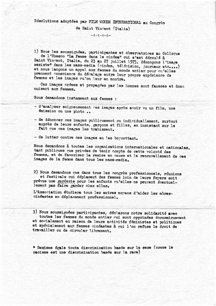 Marie-Pierre Herzog, Agnès Varda, María Luisa Bemberg © Bill Thompson Chantal Akerman © Bill ThompsonSusan Sontag © Bill Thompson Anna-Lena Wibom, Anna Karina © Dominique Roger Atiat El Abnoudi © Bill Thompson Helke Sander © Bill Thompson Isa Hesse © Bill Thompson Vivian Ostrovsky and Nicole Stephane, producer © Dominique Roger Standing Larissa Shepitko © Dominique Roger Agnès Varda, Chantal Akerman, Durga Khote © Bill Thompson Vivian Ostrovsky, Anna Karina, Isa Hesse © Dominique Roger Hôtel Billia © Bill Thompson Elise Pouliot, Silvia Spring, Mira Hamermesh © Bill Thompson Helke Sander & Vivian Ostrovsky © Dominique Roger Helke Sander & Valie Export © Dominique Roger Vivian Ostrovsky, Anne Claire Poirier, Mira Hamermesh, Marie-Pierre Herzog (Unesco) © Dominique Roger Provisional resolutions and statutes of the Film Women International associationRome Daily American , July 30, 1975Corriere della Serra , July 26, 1975
